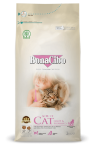BonaCibo Adult Cat Light & Sterilised; is formulated for neutered or over weight cats. It contains carefullly balanced protein and fat levels to provide weight control in a healthy way, whilst still providing all of the essential nutrients in a delicious food.